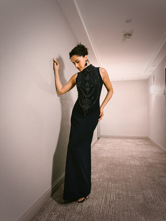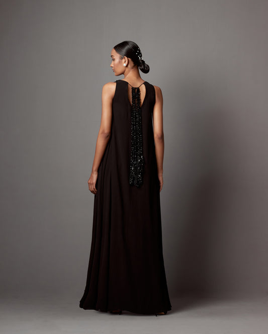 Best SellerBlack Georgette Crystal & Tassel Work Maxi Dress