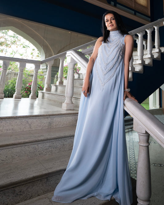 Divya Kapoor in Ice Blue Georgette Embroidered Gown