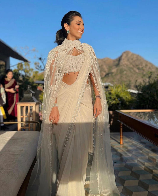 Masoom Minawala in Our Ivory Opaline Cape Saree Set