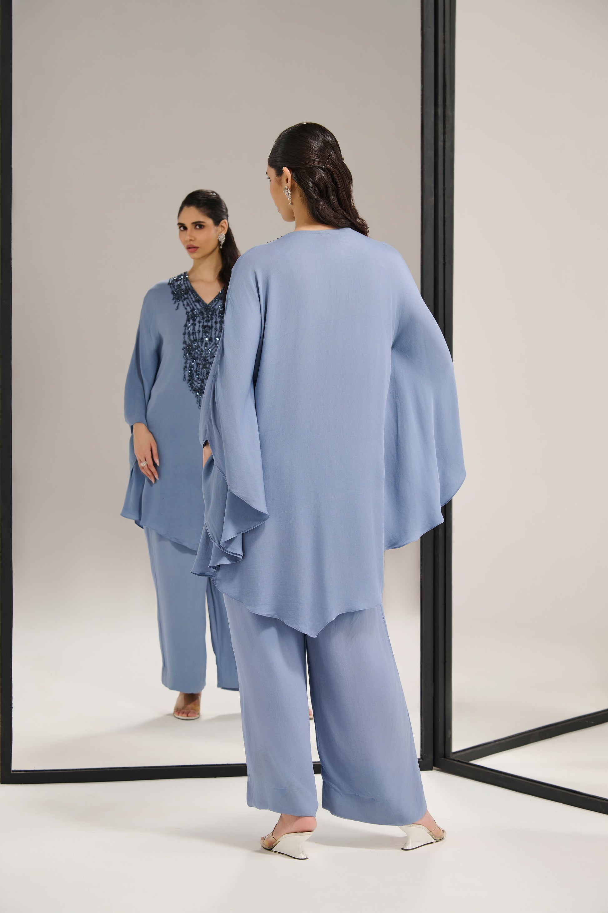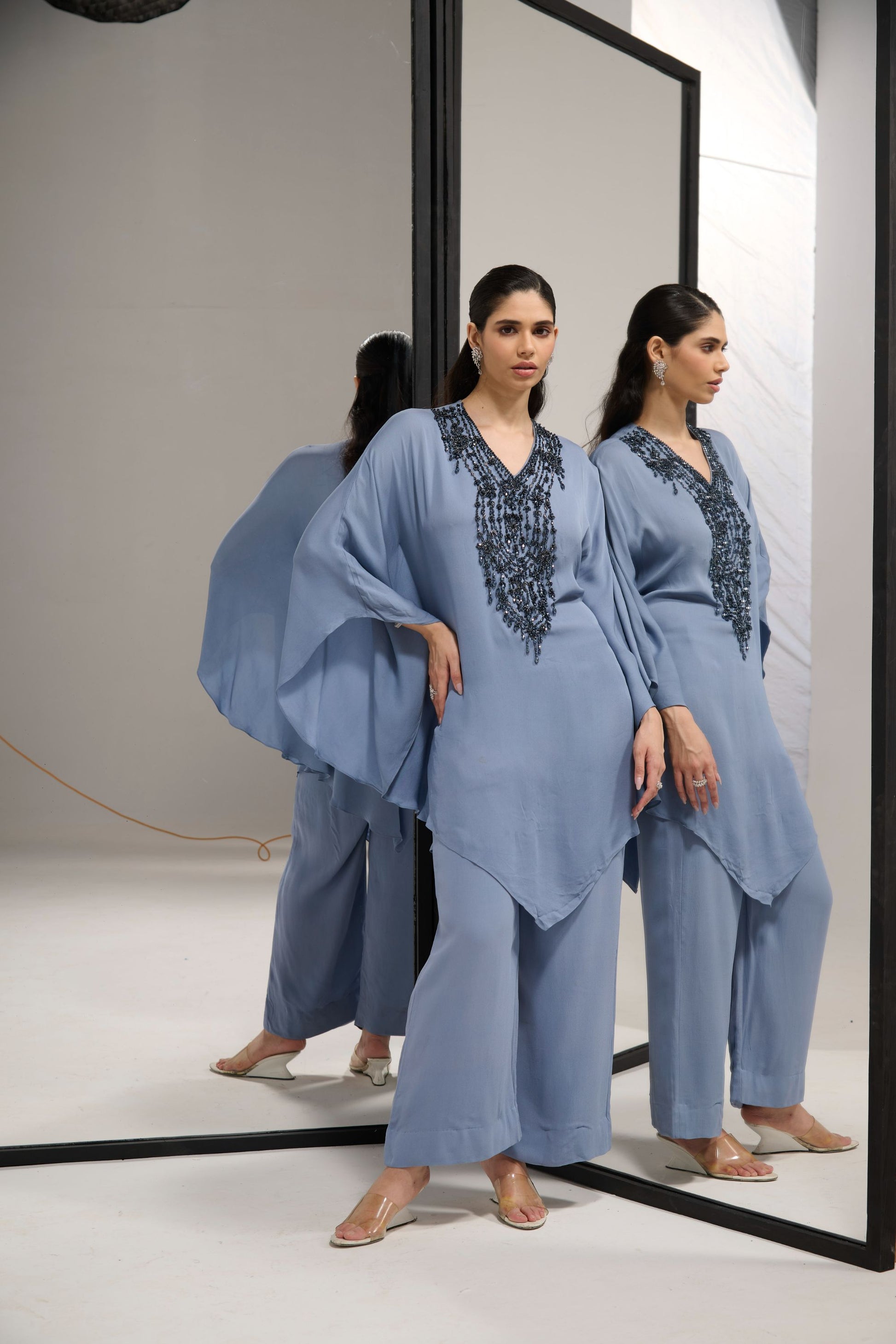 A fluid kaftan in double georgette with breezy, free-flowing sleeves that create movement, paired with tailored pants. The neckline of the bodice is richly adorned with drop crystal embroidery, evoking sophistication.