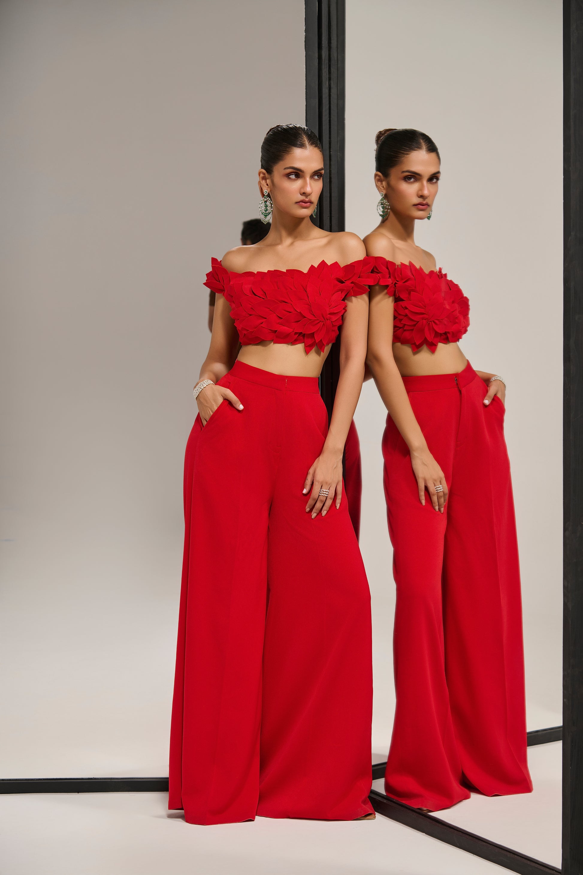 A striking red co-ord featuring wide pants and an off-shoulder top with elevated petal applique. The textured silhouette meets soft detailing for a look that is both modern and expressive.